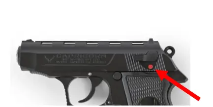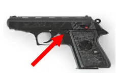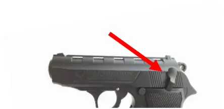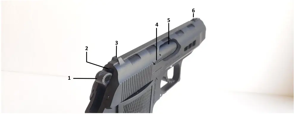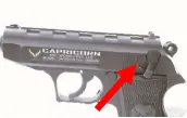 6. After the last round has been fired at which time the magazine follower exerts upward pressure on the slide stop causing it to engage the slide and hold it in the “open” position. In order to make it return to its rest position, pull the slide fully back to its rear end and release it, let the slide go forward (you must remove the empty magazine first).