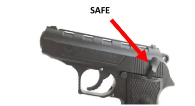 1. Point the pistol in a safe direction and rotate the safety decocking lever into the down (SAFE) position.