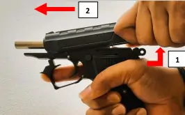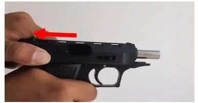 2. Hold the slide from its serrated sides with the rear end with thumb and fingers and pull the slide in fully backward position and extract any cartridge from chamber and clear it from the pistol.
