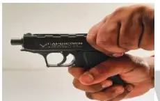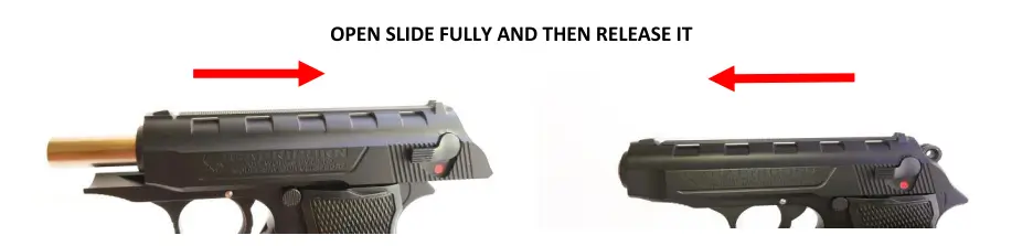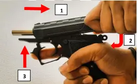 3. Hold the pistol with one hand keeping your finger away from the trigger. With the other hand pull the slide to its limit and release it, so slide will go forward under recoil spring pressure and insert one cartridge in the chamber.