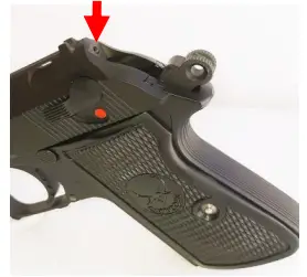 9. To check whether there is bullet in the chamber of your pistol there is a loaded chamber indicator pin which can be observed by looking at the rear of the slide just above the hammer, see Fig. (5.8) noting a small hole. If the firearm’s chamber is loaded, you will observe a pin protruding from this hole, see Fig (5.9).